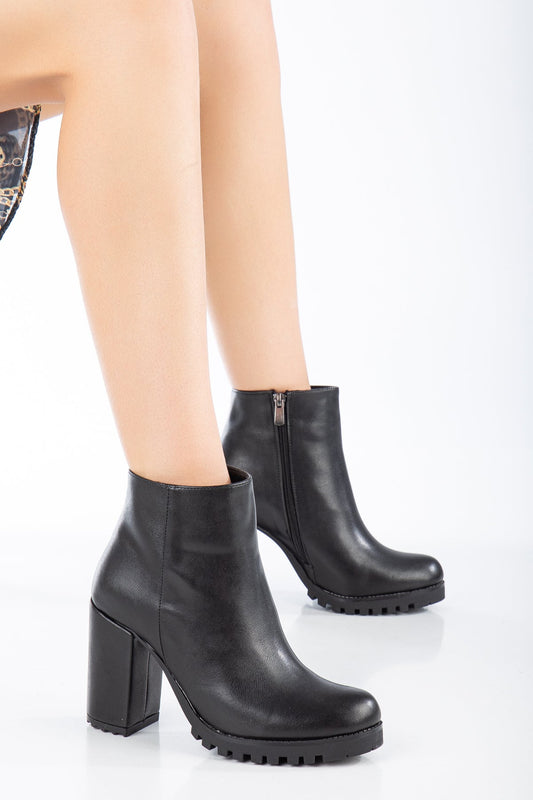 Trak Tabanlı Yuvarlak Burunlu Topuklu Kadın Bot - Siyah