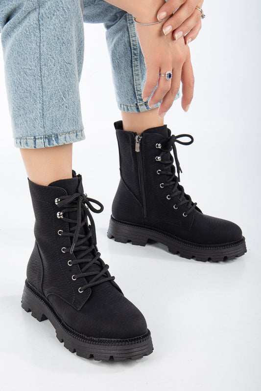 Fermuar Detaylı Rahat Kalıp Bağcıklı Kadın Bot - Mat Siyah