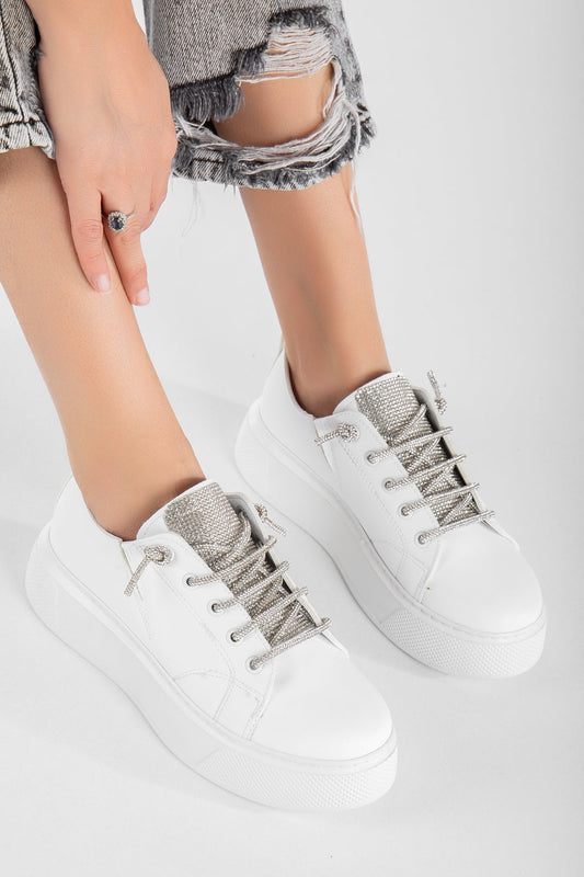 Kalın Taban Taşlı Kadın Spor Ayakkabı - Beyaz