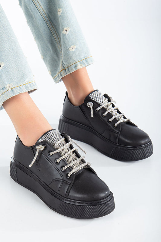 Taş Bağcıklı Streç Detaylı Günlük Kadın Ayakkabı Siyah