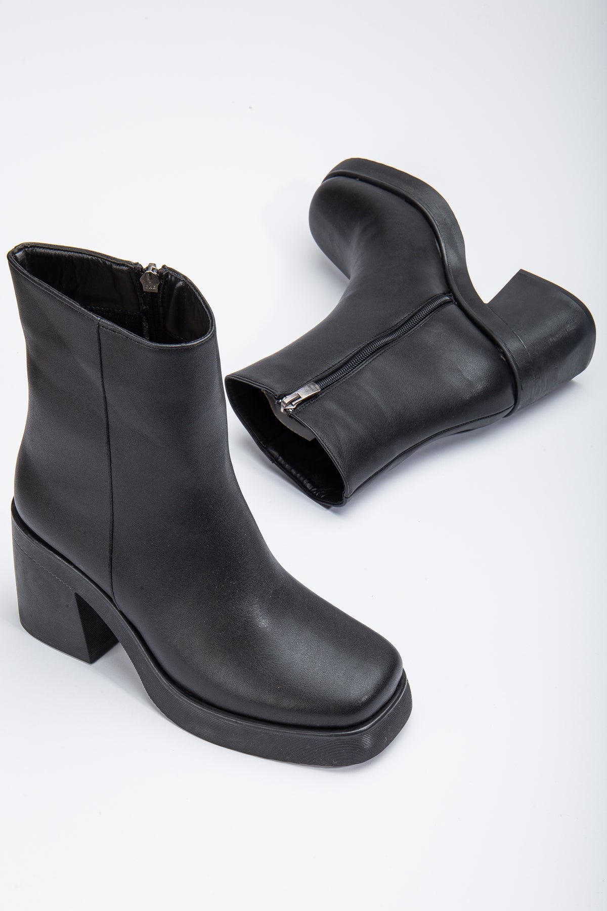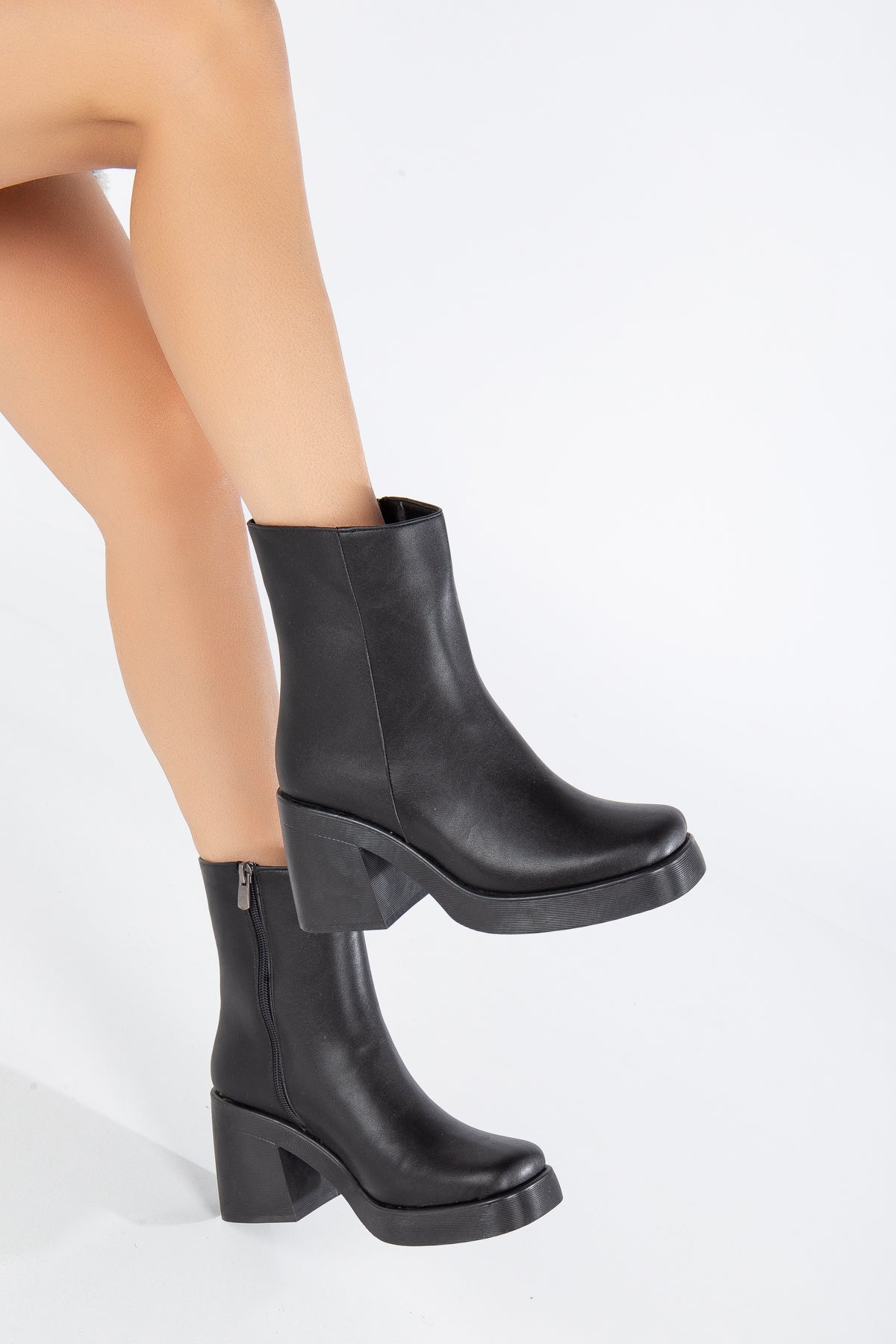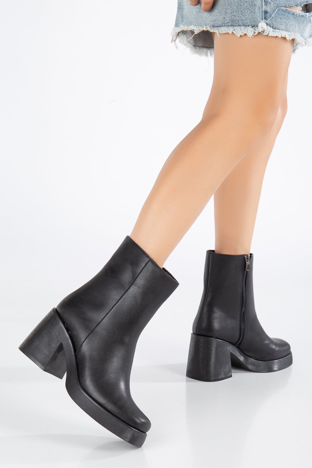 Kadın Cilt Fermuarlı Kalın Tabanlı Bot - Siyah