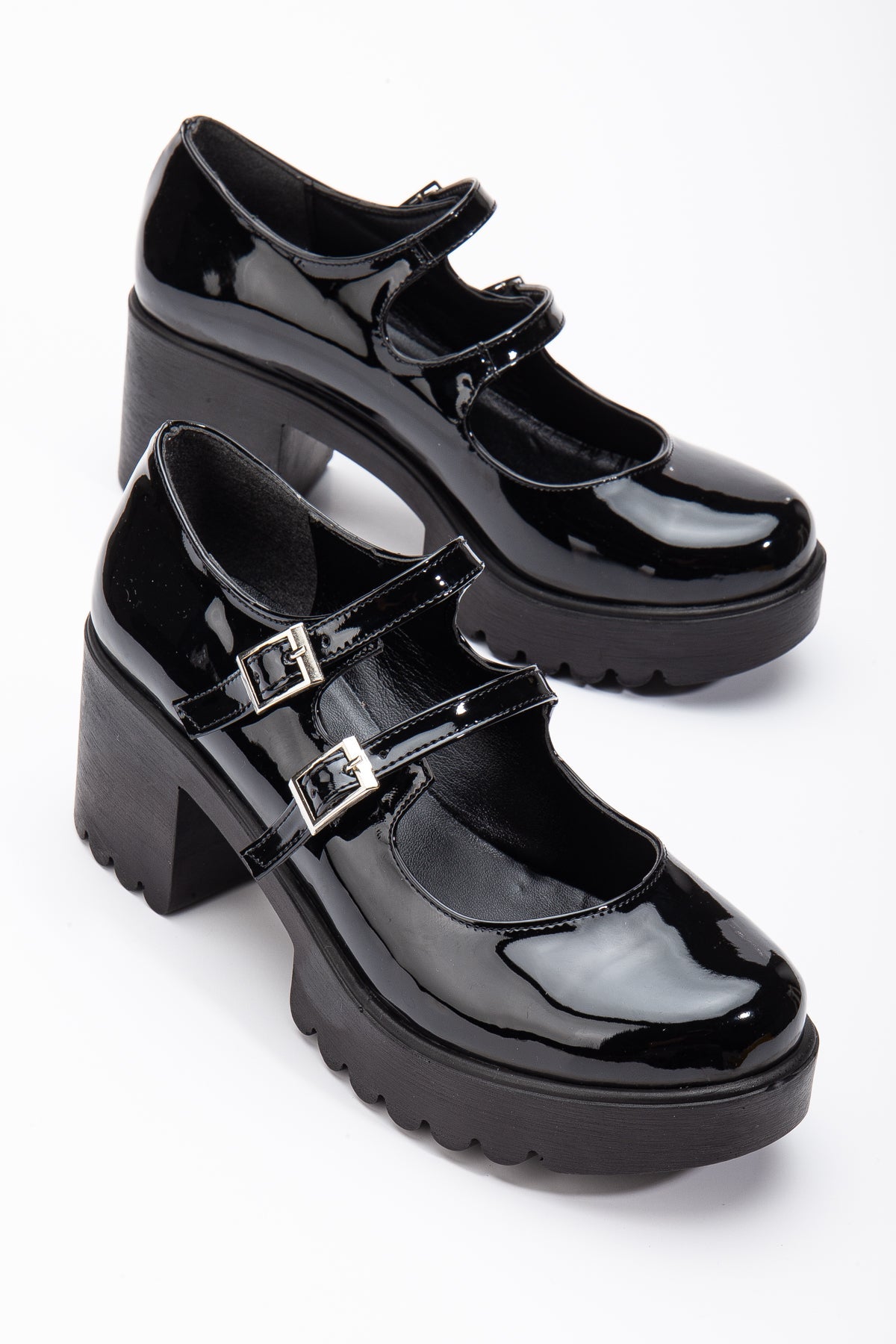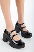 Rugan Çift Tokalı Yüksek Taban Kadın Ayakkabı - Siyah