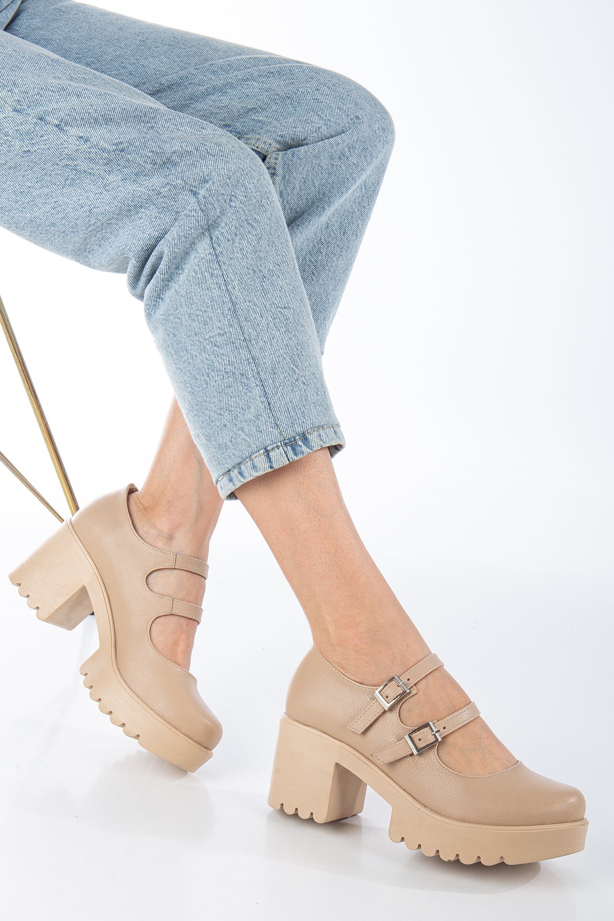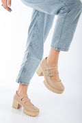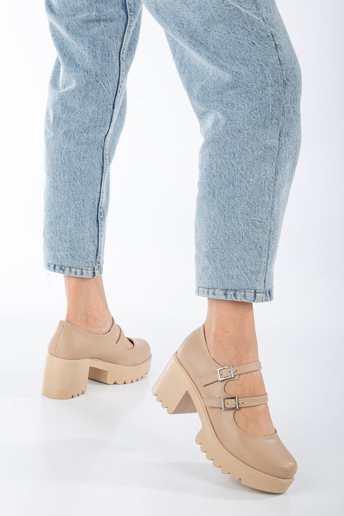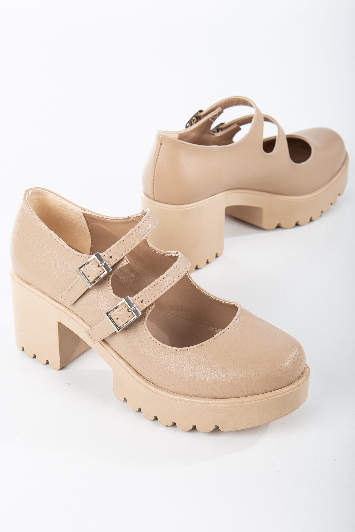 Rugan Kadın Çift Tokalı Yüksek Taban Ayakkabı - Nude