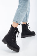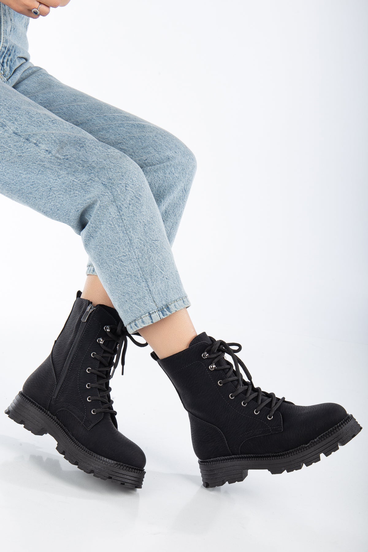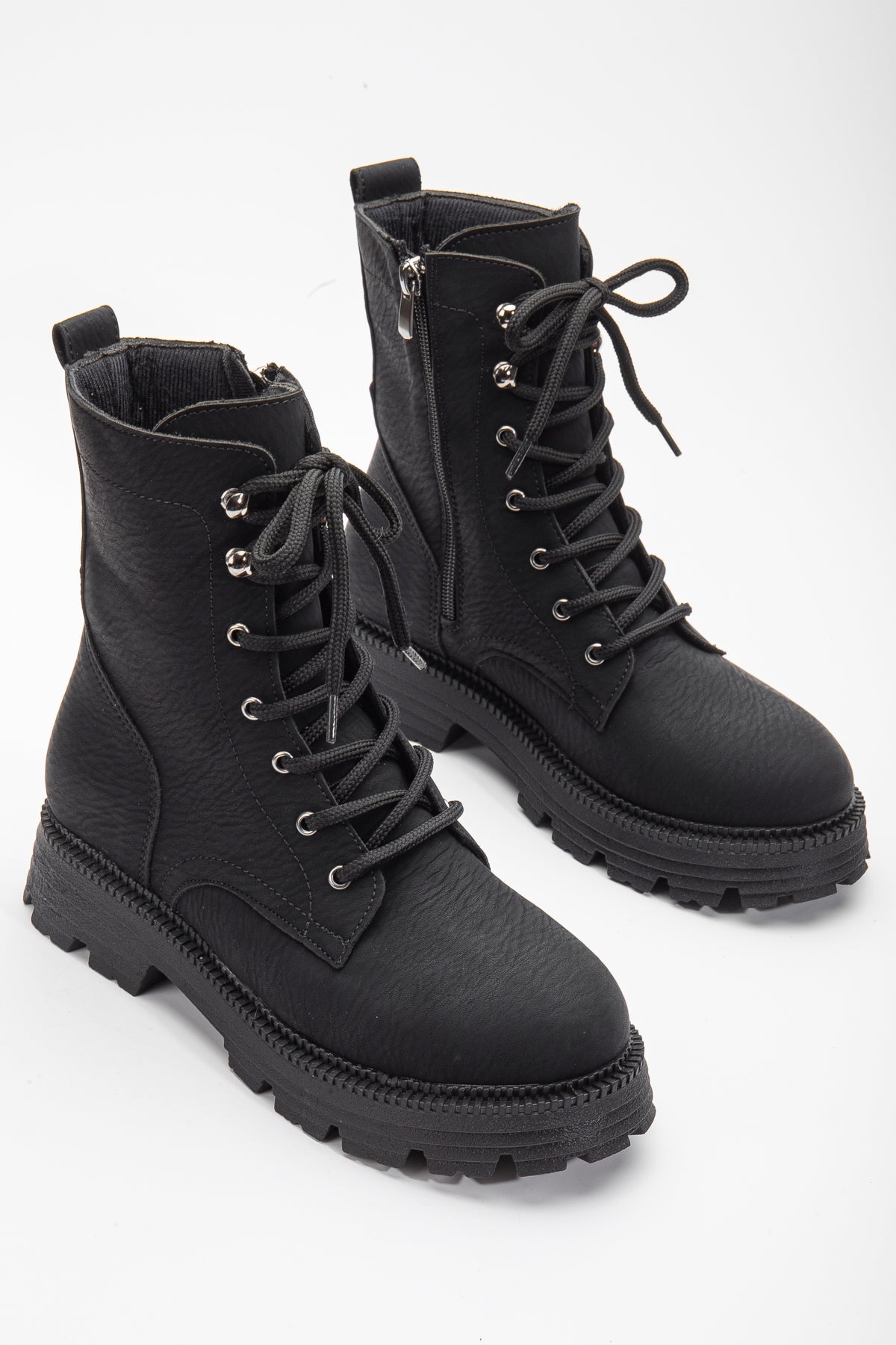Fermuar Detaylı Rahat Kalıp Bağcıklı Kadın Bot - Mat Siyah